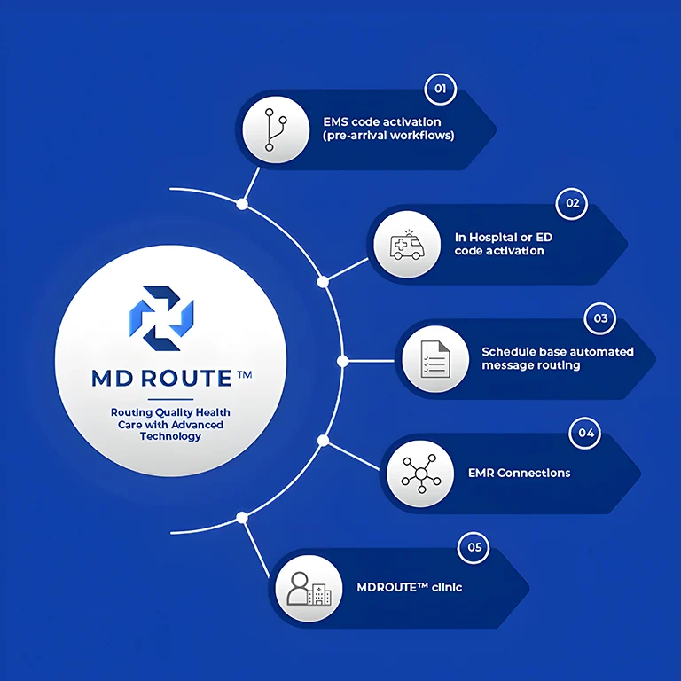 MDROUTE™ provides end-to-end care team coordination combining intelligent routing, secure multi-modal communication, and EMR integration to eliminate delays in time-critical conditions.